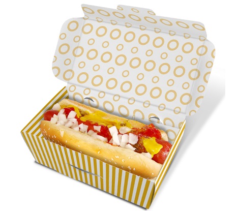 Hot dog num pão com sementes de sésamo numa caixa de papel com padrão de círculos e riscas douradas.