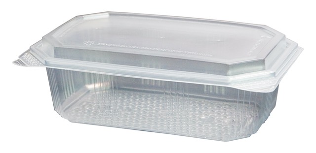 Embalagem take away retangular de 1000g, estanques e empilháveis, produzidas em PP translúcido com tampa de encaixe. Tampa incorporada.