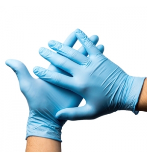 Mãos com luvas de látex azuis